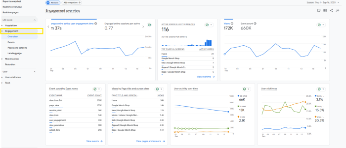 Ortalama ne kadar vakit geçirdiği, etkileşim gerçekleştiren ortalama kullanıcı sayısını, aktif kullanıcı sayısını, sayfa görüntüleme ve kaç event tetiklendiğini, en çok hagi eventlerin tetiklendiği, en çok ziyaret edilen sayfalar, 30, 7, 1 gün olmak üzere aktif olan kullanıcılar, günlük ve haftalık kullanıcıların aylık aktif kullanıcılara göre oranı gibi verileri buradan görebiliyorsunuz.