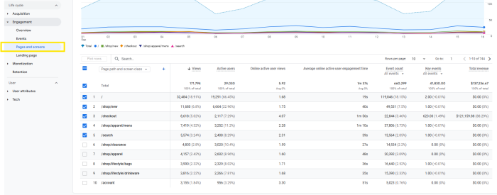 Oturum sayısı, aktif kullanıcı sayısı, yeni kullanıcı sayısı, sitede geçirdiği ortalama süre, en fazla event olan sayfalar, en çok gelir getiren sayfalar, kaç kişi önemli işlem gerçekleştirdi burada öğrenebilirsiniz.